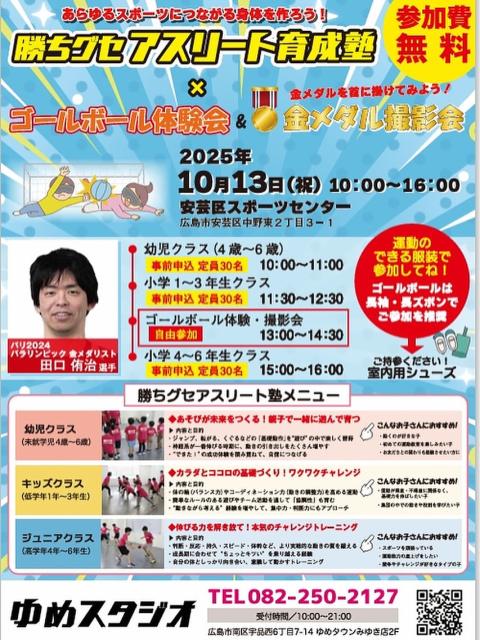 10月13日(月)パラリンピック金メダリスト (パリ2024)の田口侑治さんをお招きして 『ゴールボール体験会』&『金メダル撮影会』を開催します!この機会に本物の金メダルを実際に見て、触って 首にかけてみましょう😊 イベントでは勝ちグセアスリート育成塾の 年齢別の楽しいトレーニング体験もあります。 お申込みはプロフィールリンク 勝ちグセアスリート育成塾HPから♪ kachiguse.yumesutudio.info たくさんのご参加お待ちしております。 【日時】10月13日(月)スポーツの日 【場所】安芸区スポーツセンター 【参加対象】4歳~6年生 【参加費】無料 【プログラム】 ①勝ちグセトレーニング体験(幼児) 10:00~11:00 ②勝ちグセトレーニング体験(低学年) 11:30~12:30 ③ゴールボール体験会&金メダル撮影会13:00~14::30 ④勝ちグセトレーニング体験(高学年) 15:00~16:00 主催:安芸区スポーツセンター #勝ちグセアスリート育成塾 #イマナラコソダテ #イマナラコドモスクール #イマナライベント #安芸区スポーツセンター #安芸区 #中野東 #スポーツイベント #子供のスポーツ #トレーニング体験
