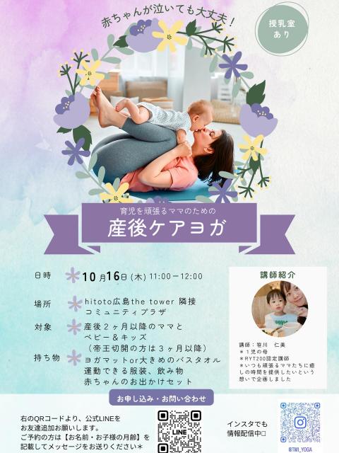 . 東千田町教室で子連れママ向けに、 【産後ケアヨガ】を行います🩵 ベビーはマット(こちらでご用意します)におろして、 キッズは隣でおもちゃで遊んでもらいながら、 (途中抱っこや授乳・おむつ替えをしても大丈夫🤱) ママたちはヨガを行います☺️ 特に産後緩みやすい骨盤周りのケアを行う予定です! 凝り固まった身体を一緒にほぐしませんか? 👶が泣いてもお喋りしても大丈夫🥰 みんな子連れの空間で、気を使わず過ごしましょう。 初めての方や身体が硬い方も大歓迎です🎌 いつも家事育児を頑張るママたちの、 癒しの時間になりますように‥‥☺️🍀 日時*10月16日(木)11:00〜12:00 場所*広島市中区東千田町1-1-55 hitoto広島the tower 隣接コミュニティプラザ コミュニティホール 対象*産後2ヶ月以降のママとベビー&キッズ (帝王切開の方は産後3ヶ月以降) 費用*1,000円 持ち物*ヨガマットorバスタオル、飲み物、運動できる服装、赤ちゃんのおでかけセット 🍼授乳室あり 🐥おもちゃあり(0歳〜5歳くらいまで) 💌ご予約希望の方は、プロフィールの公式LINEをお友達追加いただき、【お名前・お子様の月齢】を送ってください!気になることがあればいつでもお問い合わせください🌱 #広島市中区 #広島市中区ヨガ #広島市中区ヨガスタジオ #広島市中区東千田町 #hitoto広島コミュニティプラザ #hitoto広島thetower #広島市ママヨガ #広島市ママと繋がりたい #広島市ママイベント #広島市ママの習い事 #広島育児 #広島育児情報 #クリップ広島 #広島段原ショッピングセンター#広島市南区 #広島市南区段原 #イオンモール段原 #イオンモール段原ショッピングセンター #kimama #イマナライベント #イマナラママスクール #託児付きヨガ #広島託児付きヨガ #広島託児 #広島市託児 #広島一時預かり #広島ヨガ #広島ヨガ教室 #ママのヨガ教室 #産後ケア