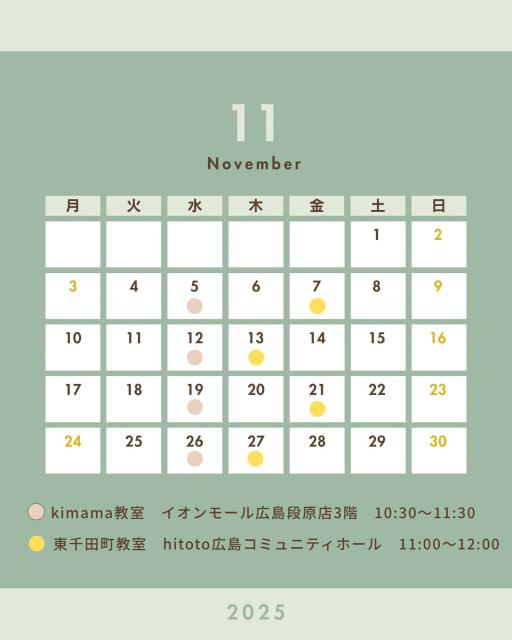 . 11月のスケジュール🌕 一気に寒くなってきましたね🍂 寒いと無意識に身体がぎゅっと縮こまって、 めぐりが悪くなりやすいです。 来月も呼吸に合わせてゆったりとフローヨガを 一緒に楽しみましょう☺️🫶 詳しいヨガレッスンの内容や強度は、 公式LINEをお友達追加ください🧘🪐 公式LINE⬇️ https://lin.ee/9BDexbC #広島市中区 #広島市中区ヨガ #広島市中区ヨガスタジオ #広島市中区東千田町 #hitoto広島コミュニティプラザ #hitoto広島thetower #クリップ広島 #広島段原ショッピングセンター#広島市南区 #広島市南区段原 #イオンモール段原 #イオンモール段原ショッピングセンター #kimama #イマナライベント #イマナラママスクール #託児付きヨガ #広島託児付きヨガ #広島託児 #広島市託児 #広島一時預かり #広島ヨガ #広島ヨガ教室 #ママのヨガ教室 #産後ケア #メンタルケア #メンタルコントロール