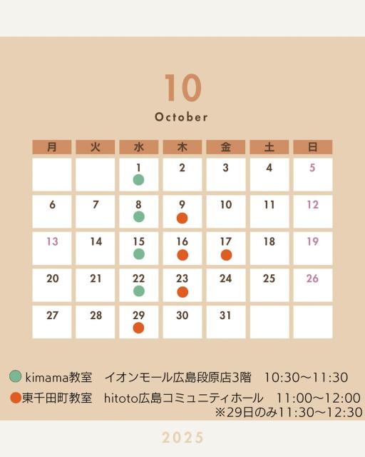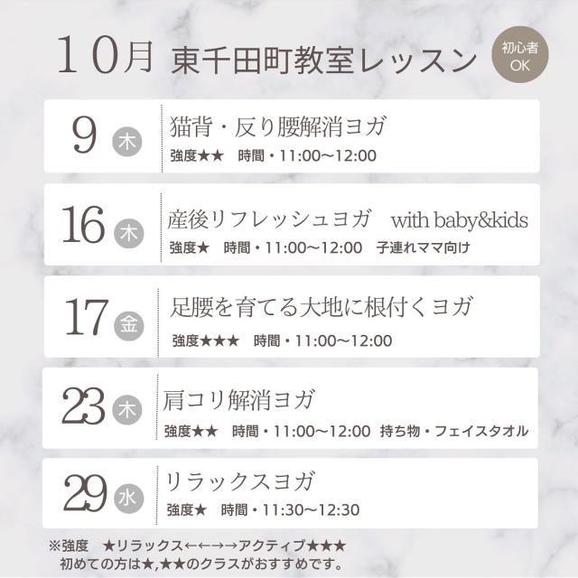 . 10月のヨガスケジュールを共有します🗓️ 深呼吸から始まる"自分のための1時間"を 一緒に体験しませんか?🧘♀️ 【クラススケジュール】 🌿kimama教室 少人数セミパーソナルレッスンです🧘♀️ 託児付き👧👦入会金・解約金など不要! 1ヶ月ごとに決めてもらえます♪ 初回無料体験実施中🔅 体験できる日:1日,8日,15日,22日(水)10:30〜11:30 月額:6,000円(月4回)※初回無料体験あり 託児希望の方:1回500円(1人あたり) ☆6ヶ月〜👶(6ヶ月未満のお子様はご相談ください) 駐車場代:無料 🌿東千田町教室 後日各日程のクラスの内容と強度を公開します🧘♀️ さまざまなヨガクラスを楽しんでもらえると嬉しいです☺️🌷 費用:1回1,000円 駐車場:お近くのコインパーキングをご利用下さい 16日(木)🆕産後リフレッシュヨガ 赤ちゃん、子ども連れママ向け👶 産後の心と身体を整えるレッスンです。 ・更衣室を授乳室として解放します ・赤ちゃんを寝かせるマットとおもちゃあります ・おくるみやバスタオルをご持参ください 🎒持ち物 ヨガマットorバスタオル/飲み物/タオル 動きやすい服装 🔰初心者の方・身体が硬い方・シニアの方も無理なく行えるようサポートしていきます。 👉ご予約希望の方は【お名前・希望日時】を送ってください💌 気になることがあればいつでもご連絡ください☺️ #広島市中区 #広島市中区ヨガ #広島市中区ヨガスタジオ #広島市中区東千田町 #hitoto広島コミュニティプラザ #hitoto広島thetower #クリップ広島 #広島段原ショッピングセンター#広島市南区 #広島市南区段原 #イオンモール段原 #イオンモール段原ショッピングセンター #kimama #イマナライベント #イマナラママスクール #託児付きヨガ #広島託児付きヨガ #広島託児 #広島市託児 #広島一時預かり #広島ヨガ #広島ヨガ教室 #ママのヨガ教室 #産後ケア #産後ヨガ #広島産後ヨガ #広島産後ケア #広島産後骨盤矯正 #広島産後ママ