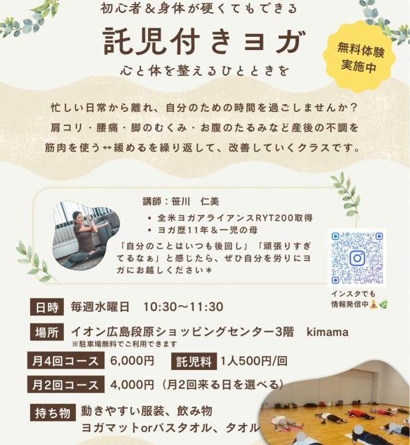 . ✴︎託児付きヨガ✴︎ 産後の身体&心の不調にお悩みのママさん集合〜! ヨガで一緒に身体と心を整えましょう♡ 日時:毎週水曜日 10:30〜11:30 場所:イオンモール広島段原ショッピングセンター 3階 kimama (駐車場2時間無料) 🍀初回無料体験実施中🍀 【通われる場合】 🧘♀️月4回コース 月額6,000円 🧘選べる月2回コース 月額4,000円 👶託児料 1人500円(1回) ☑︎生後6ヶ月〜kimama(kimama.hrsm)の一時預かりを特別価格でご利用いただけます ☑︎生後6ヶ月未満のお子様はご相談ください ✔︎月ごとに継続するかどうか選べる ✔︎安心の少人数制 ✔︎初めて・身体が硬くても大丈夫👌 【ヨガの効果】 ●自律神経の乱れを整える 👉子どもへのイライラ⚡︎が減り、気持ちにゆとりが生まれる ●肩こり・腰痛・反り腰・骨盤底筋の緩み・足のむくみなどの不調の予防&解消 👉家事・育児が楽になる 👉子どもに負けない体力・スタミナがつく ●産後のケア・体型戻し 👉骨盤まわりを整えて出産前の身体に近づける ●自分だけのリフレッシュ時間 👉【ママ】ではなくか【自分】に戻れる貴重なひととき 【お問い合わせ・お申し込み】 公式LINE https://lin.ee/nYh7ruO お友達追加いただくと、毎月のイベント情報を配信します☺️ 無料体験のお申し込み希望の方は、【無料体験希望日・お名前・託児の有無】を記入の上メッセージをお送りください💌 #広島市中区 #広島市中区ヨガ #広島市中区ヨガスタジオ #広島市中区東千田町 #hitoto広島コミュニティプラザ #hitoto広島thetower #クリップ広島 #広島段原ショッピングセンター#広島市南区 #広島市南区段原 #イオンモール段原 #イオンモール段原ショッピングセンター #kimama #イマナライベント #イマナラママスクール #託児付きヨガ #広島託児付きヨガ #広島託児 #広島市託児 #広島一時預かり #広島ヨガ #広島ヨガ教室 #ママのヨガ教室 #産後ケア